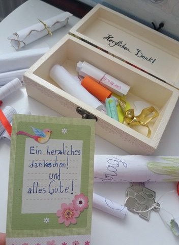 Pe o mică măsuță in sânul sediului “Frau Angi- Germană pentru toți” stă, de cateva luni de vară, o cutiuță cu amintiri de la fostii elevi a lui Frau Angi. Vladimir, actual cursant, o deschide cu o curiozitate specifică lui și începe să citească fiecare bilețel cu nerăbdare. Așa ne-a stârnit și nouă amintiri și dorința de a vă povesti despre un moment cu adevărat emoționant. Dar, prima dată, să descoperim sursa bilețelelor și cum a început totul.